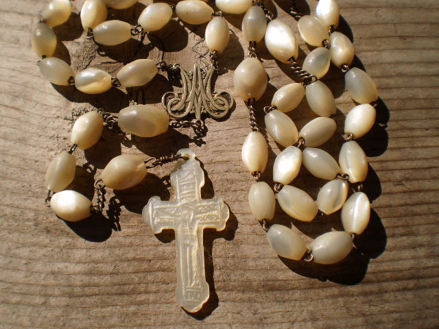 Sweet 1800s hand cut mother of pearl rosary with MOP center and cross.